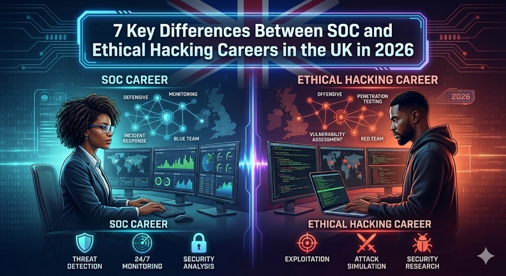 If you’re choosing between a Security Operations Centre (SOC) path and Ethical Hacking in 2026, you’re deciding how you want to defend the same mission: protecting systems and data. This guide breaks down the seven differences so you can pick the path that fits your skills, personality, and goals.